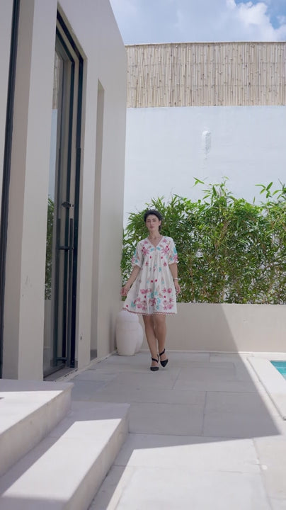 Off White Cotton Embroidered Empire Short Dress with Puff Sleeves